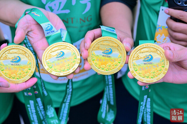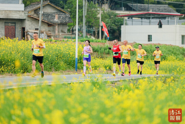 有人步履从容、匀速前行,有人高举队旗、奋力冲刺,更多人边奔跑边举起手机,定格路旁漫山遍野的金色花海。