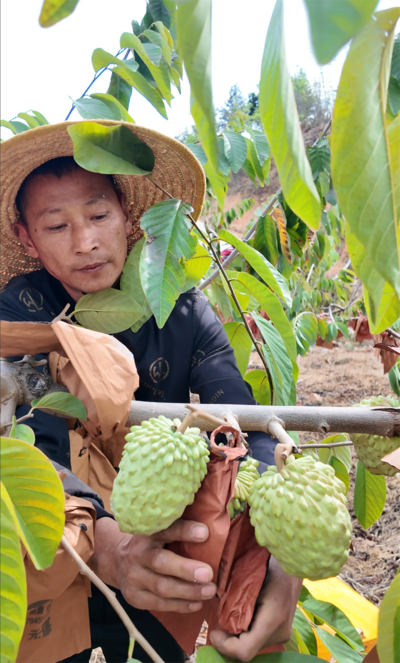 数据最有说服力:2025年基地年产释迦果50余吨,年产值120余万元,果子均价15元/斤。曾经的荒坡秃岭,如今一层层果园顺着山势铺开,变成了村民眼里的“金山银山”,一颗颗释迦果,成了企业增效、农民增收的“软黄金”。