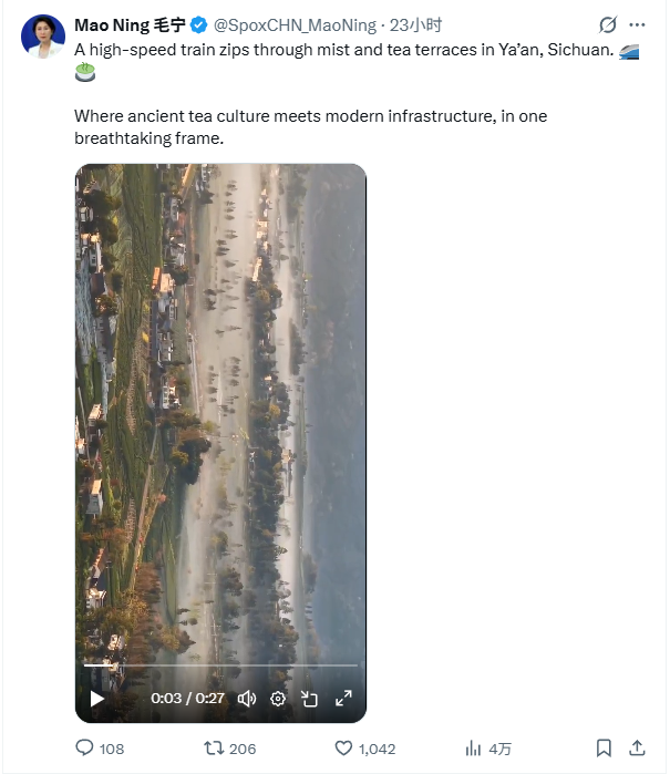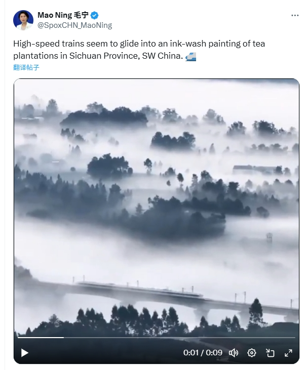 时间回溯至3月9日,毛宁就曾转发一条“高铁驶入‘千里江山图’”的短视频,配文赞叹“Where ancient tea culture meets modern infrastructure, in one breathtaking fr
