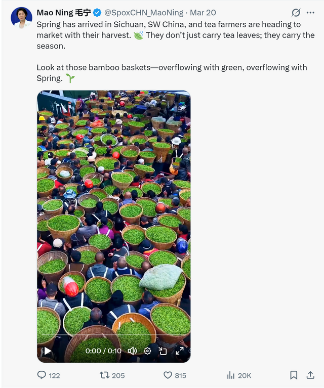 时隔11日,外交部发言人毛宁再次向世界推介雅安。她于3月20日在社交账号上写道:Spring has arrived in Sichuan, SW China, and tea farmers are heading to market with their harvest. They don't just carry tea leaves; they carry the season.(中国西南地区的四川迎来了春天,茶农们带着新茶赶赴市集。他们肩上挑的不只是茶叶,更是整个春日。)Look at those bamboo baskets—overflowing with green, overflowing with Spring.(瞧那些竹筐,盛满新绿,也盛满了春光。)