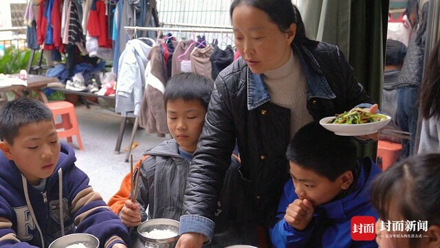 张蓉照顾孩子们吃饭。