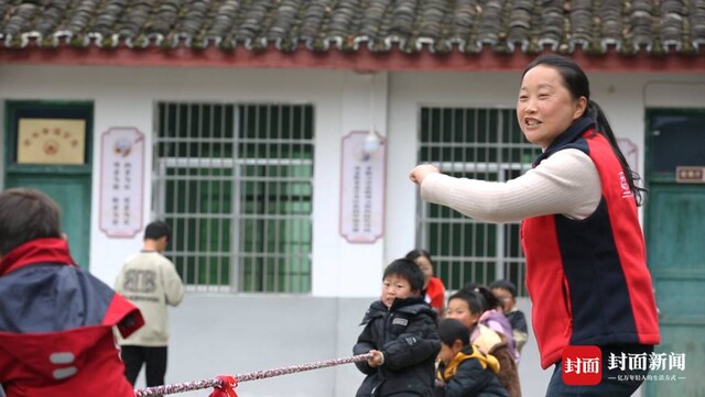 张蓉在“童伴之家”与孩子们一起拔河。