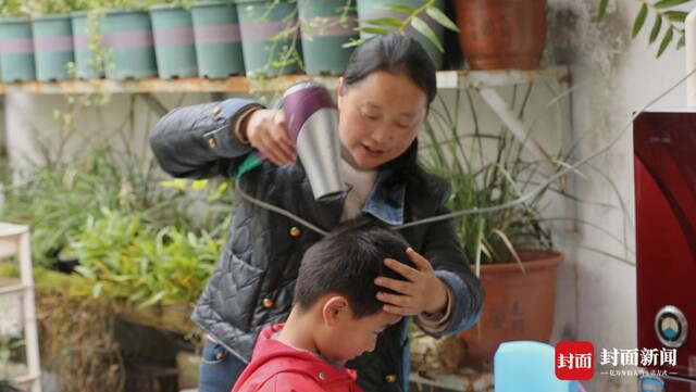 张蓉为年龄较小的孩子吹头发。
