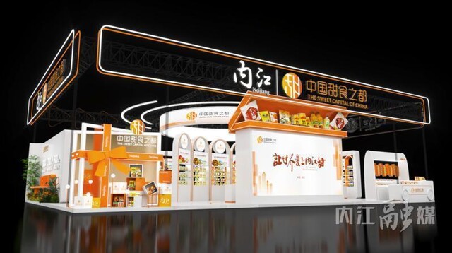 设计立意更具新意。内江馆以“中国甜食之都—内江”为主题,采用暖橙色为辅色,视觉温暖雅致、主题鲜明突出;主通道设置“礼盒开启”样式LED造型,将内江之“甜”具象为“甜蜜之礼”,辨识度与记忆点显著优于传统展馆。