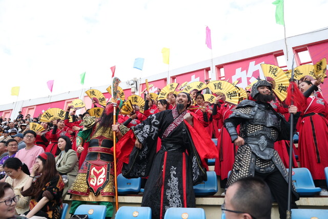 比赛还没开始,南充的看台上先热闹了起来。“刘关张三兄弟来了!”比赛间隙,“嘉陵汉韵·三国助威团”走上看台,汉服表演团队手持折扇,扇面翻飞,将三国文化与汉服之美交织成一幅跨越古今的画卷。南充是《三国志》作者陈寿的故乡,这一天,三国文化在绿茵场边活了起来。