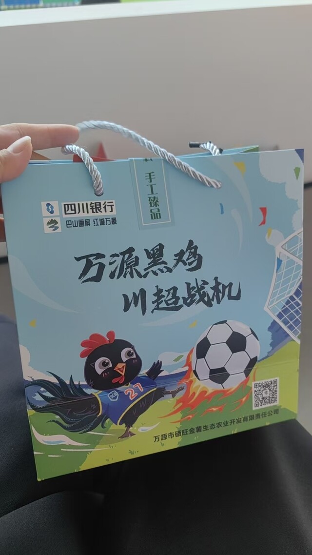 达州则把万源的特产“搬”进了体育场。两万多名球迷入场时,每人收到一份万源特产礼盒——旧院黑鸡麻辣鸡块、茶叶、腊肉干、茶焗蛋黄猪肝、鱼皮土豆……地道山货让球迷们还没开赛就尝到了达州的滋味。绵阳球迷邱文杰拆开麻辣鸡块就尝了一口:“鲜香带点麻辣,非常对四川人的胃口,有机会一定要去万源走走看看。”
