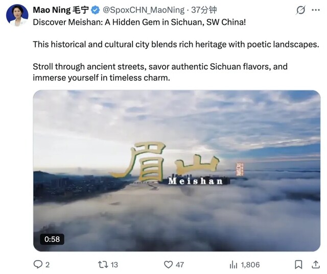 3月27日,外交部发言人毛宁在其海外社交平台发布推文和视频,向全球网友推介眉山。