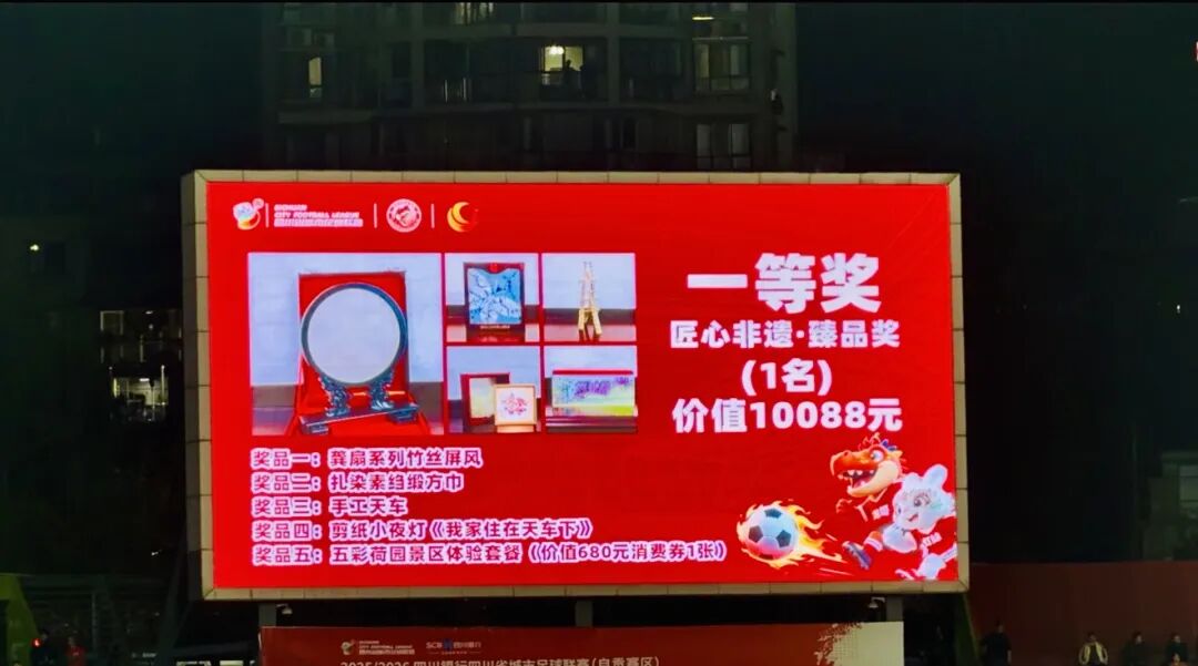 经过90分钟鏖战,双方最终1:1握手言和。尽管未能全取三分,但自贡球迷的热情从主会场燃至贡井区多个第二观赛点,五彩荷园、盐工俱乐部、立玲夜宵、大修厂工厂烧烤四大点位人声鼎沸,而赛前贡井专场精心准备的伴手礼与赛中的重磅抽奖,更让这场赛事成为一场全民狂欢。