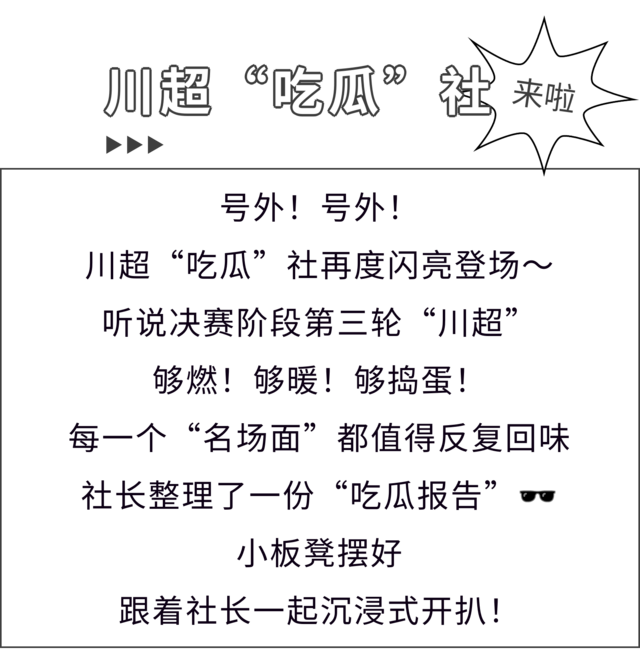 下一轮大战即将开启,不知道又会有哪些名场面和热梗出圈?咱们继续蹲守川超“吃瓜”社,一起解锁“川超”的更多精彩!