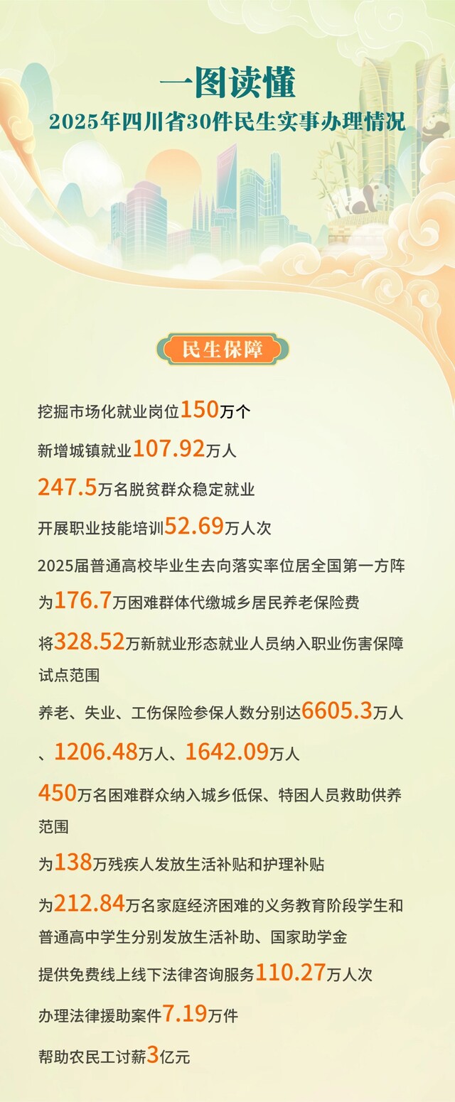 3月30日,这是记者从四川省第十四届人民代表大会常务委员会第二十六次会议上获悉的数据。今年,省人大常委会首次听取和审议年度民生实事完成情况。按照有关法律法规和省人大常委会安排,受省政府委托,省人民政府秘书长胡元坤在会上报告了2025年度全省30件民生实事工作情况。