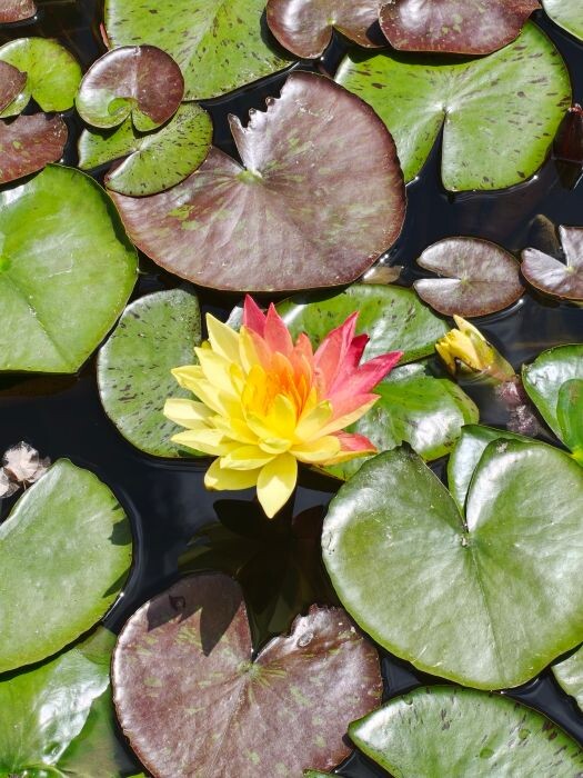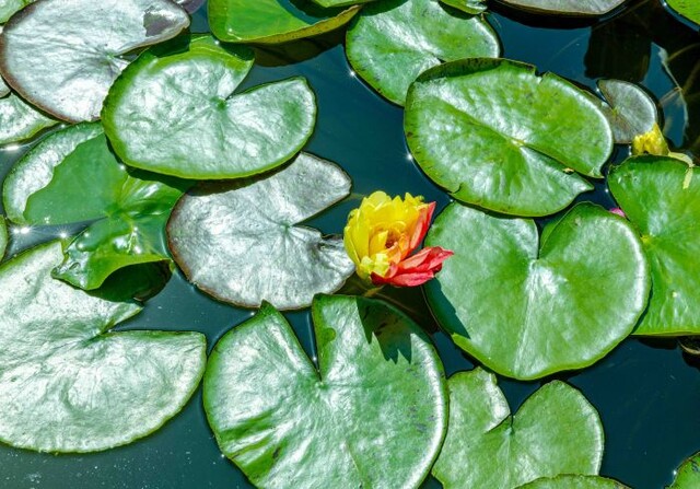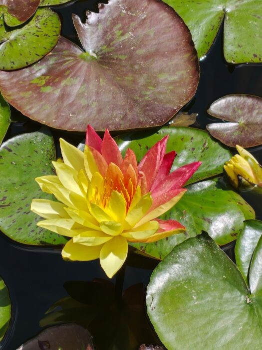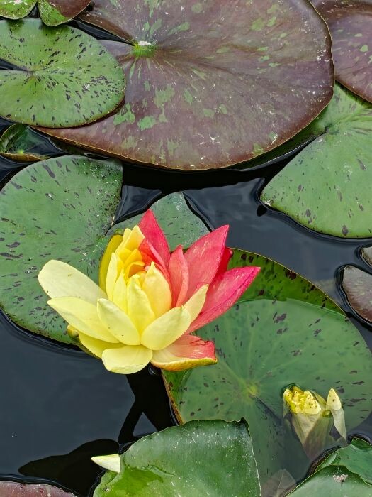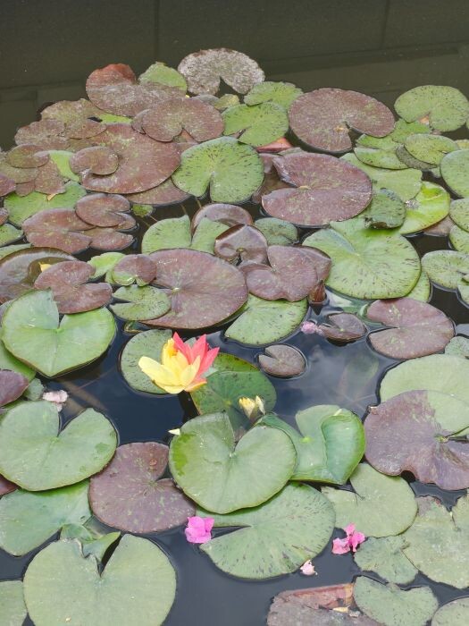 红、黄两种颜色分别占据同一朵睡莲花瓣的两部分,其中黄色面积略微大一些。睡莲在绿色荷叶的映衬下,更加艳丽动人。青宇介绍,从攀枝花学院南门进入后,直行到图书馆前的小水塘,就可以看到这株罕见的双色睡莲了。据她观察,绽放的时间约为上午9时至下午2时。