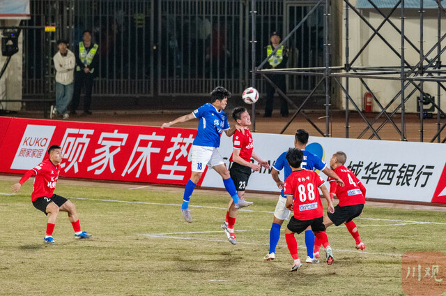 达州川汉子队对阵绵阳九洲长虹队现场,两队球员拼抢头球 摄影/C视觉签 陈琨
