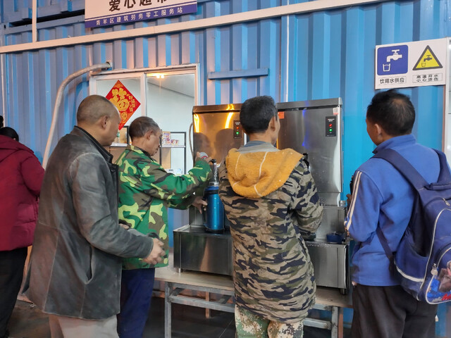 “来2个包子、1个鸡蛋。3元‘扫’过去了哦!”在服务站爱心食堂窗口前,段师傅接过热气腾腾的早餐。左侧是免费热水桶,几个工友正端着杯子接水,热气从杯口冒出来。
