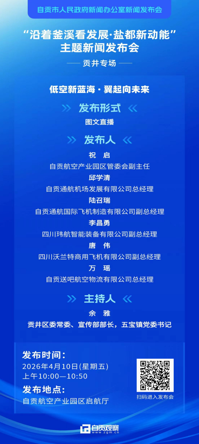 2026年4月10日(星期五)上午10:00,自贡市人民政府新闻办公室将在自贡航空产业园区启航厅举行2026年“沿着釜溪看发展·盐都新动能”主题新闻发布会贡井专场。自贡航空产业园区管委会副主任祝启介绍自贡航空产业园区发展情况,自贡通航机场发展有限公司总经理邱学清介绍飞行服务保障有关情况,自贡通航国际飞机制造有限公司副总经理陆召瑞围绕"整机制造"推介小鹰700通用飞机,四川玮航智能装备有限公司副总经理李昌勇围绕"场景拓展应用"推介“敖钦”涵道风扇高空系留主战灭火无人机系统,四川沃兰特商用飞机有限公司副总经理唐伟围绕"eVTOL新赛道"推介VE25-100电动垂直起降飞行器,自贡送吧航空物流有限公司总经理万瑶围绕"低空物流新场景"推介RA3物流无人机系统,并答记者问。发布会由贡井区委常委、宣传部部长,五宝镇党委书记余雅主持。“上贡井”客户端将全程图文直播,敬请关注!
