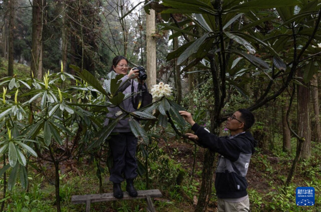 4月8日,在华西亚高山植物园,研究人员邵慧敏(左)和王飞在拍摄、记录凸尖杜鹃开花的状态。新华社记者 江宏景 摄