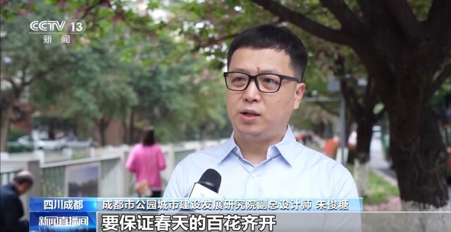 成都市公园城市建设发展研究院副总设计师 朱俊糖:我们基本上会把控在常绿6、落叶4到常绿7、落叶3的比例,保证春天的百花齐开,夏天大树成荫,秋天能看到色相的变化,灿烂的秋叶,冬日又不至于什么都掉光了,在一年四季当中去感受不同的惊喜和变化。