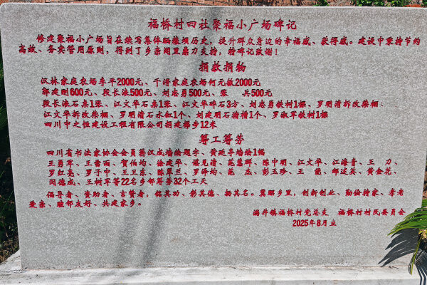 “江文华石桌一张,汉林家庭农场李平2000元,王勇军等22名乡邻筹劳32个工天……”在福桥村“和美小院”示范点,一座名为《福桥村四社聚福小广场碑记》的石碑上,每一笔捐款捐物、每一次投工投劳都被鲜红的笔墨镌刻下来。在满井,这样的石碑共有6处,它们成为当地群众口口相传的口碑和心中的丰碑。