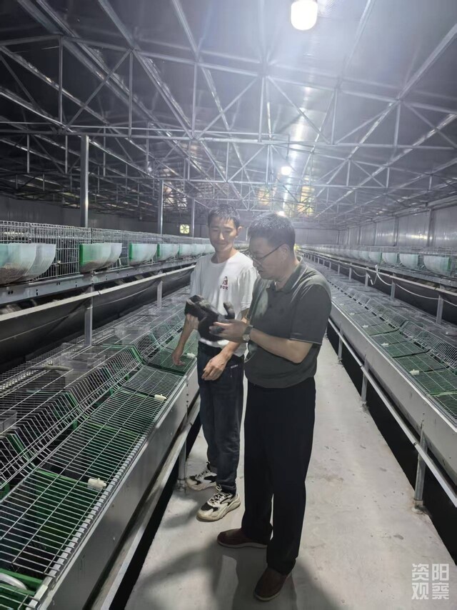 赖松家在腾逸公司指导工作人员检查兔子情况。