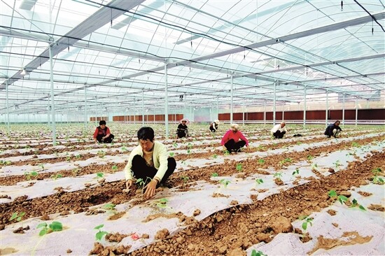 村民在种植基地内务工。