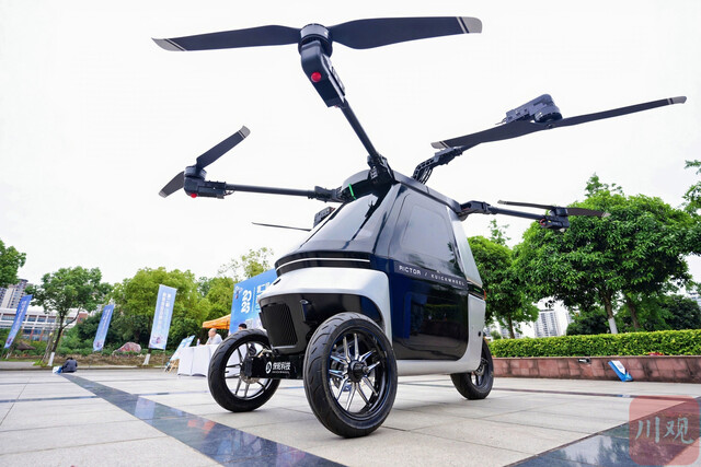 在飞行摩托展区,快轮科技带来了全球首款飞行摩托,它外观酷似倒三轮,全封闭设计,单座布局。陆地模式下最高时速70公里,续航200公里;飞行模式下最高时速72公里,续航20分钟,1分钟即可完成模式转换。公司创始人刘峰介绍,产品定价不到50万元,今年正式上线销售,目前主要面向海外市场,已经收获了10多个订单。据快轮科技合作伙伴昂鸽(四川)科技有限公司相关负责人介绍,未来有望把飞行摩托的研发和生产引入成都,并选择川内景区推动产品的体验飞行落地。