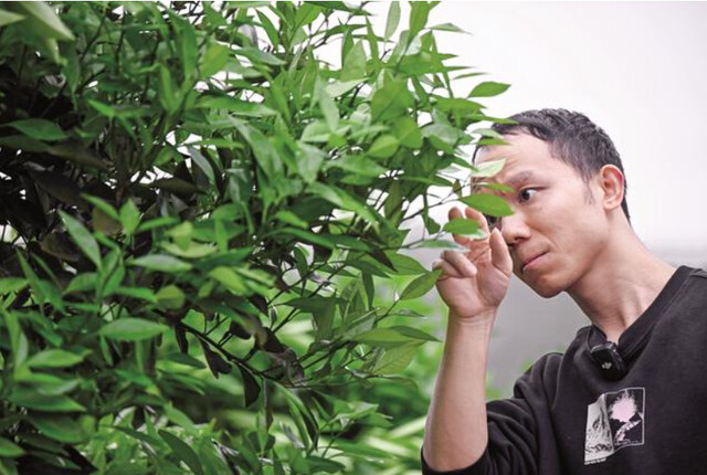 杨军在调查柑橘木虱。