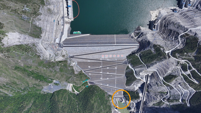 位于两河口水电站的过鱼设施(画黄圈处)与“之”字形过坝道路。受访单位供图